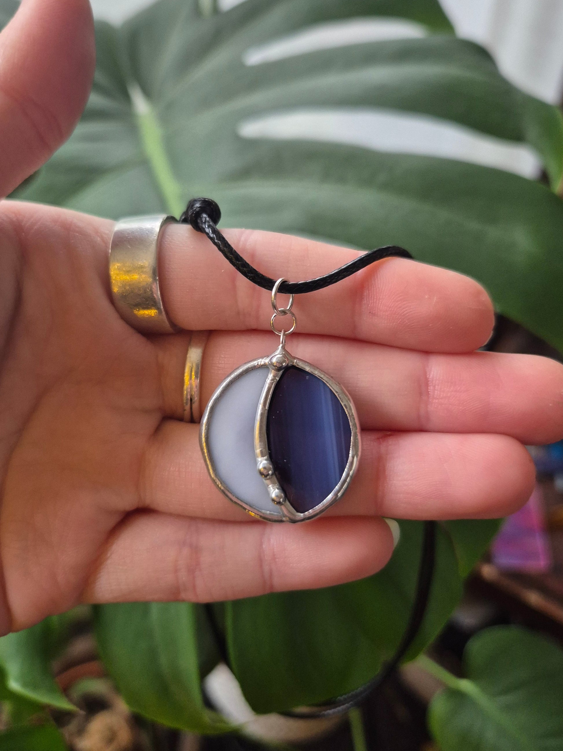Handmade stained glass crescent moon necklace in a wispy semi transparent white and purple glass.