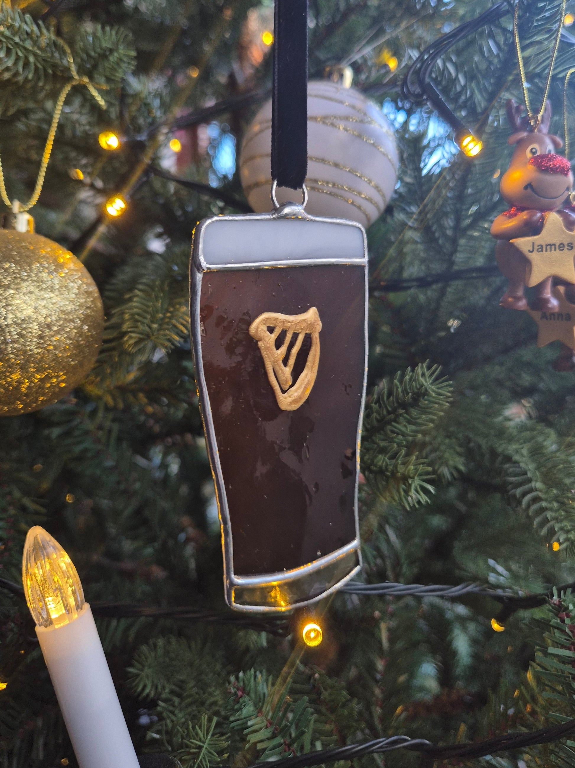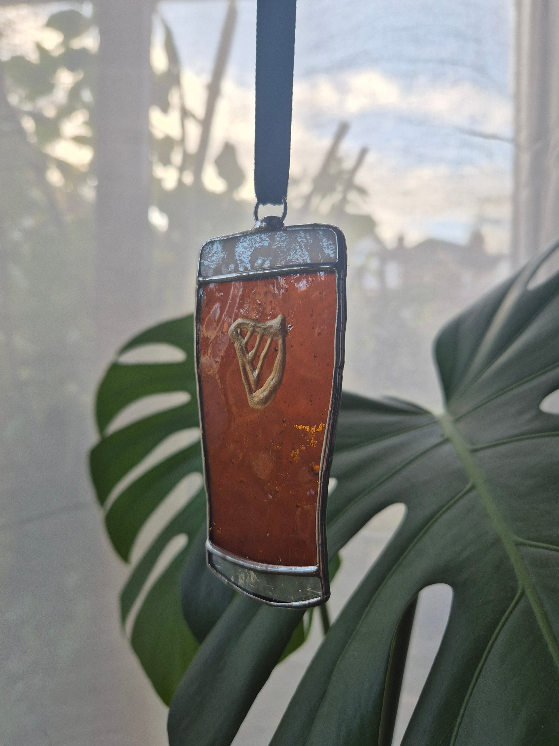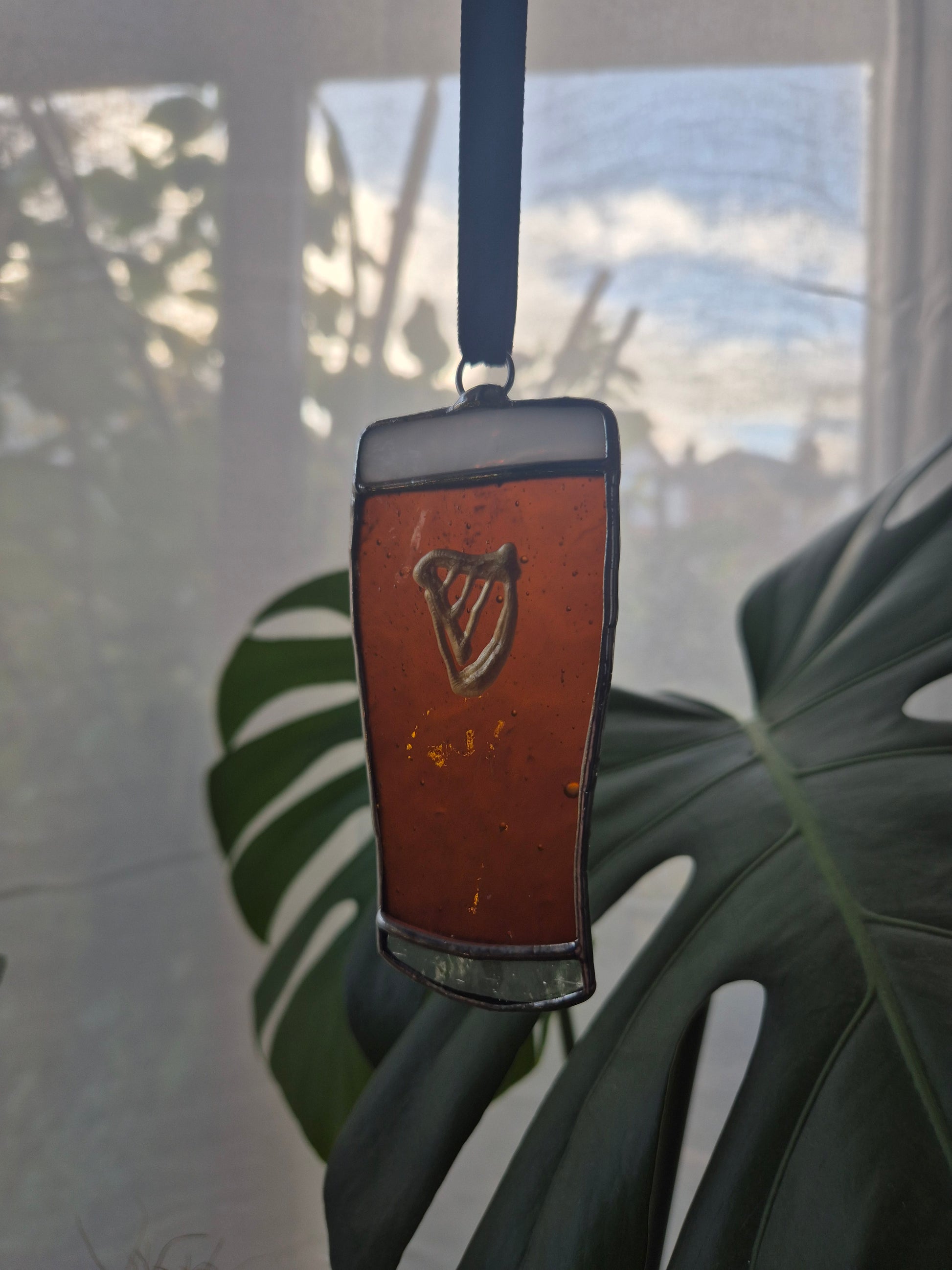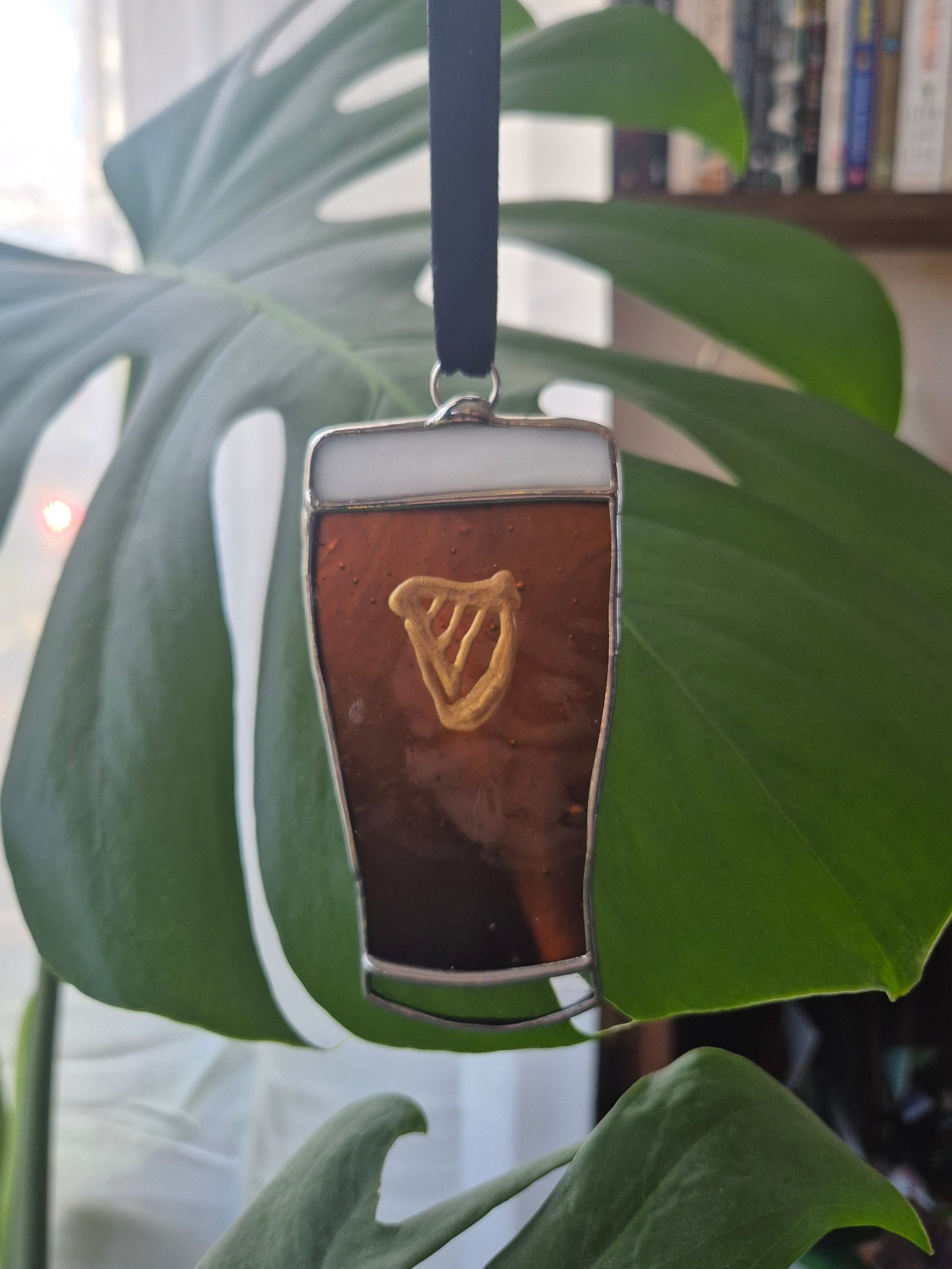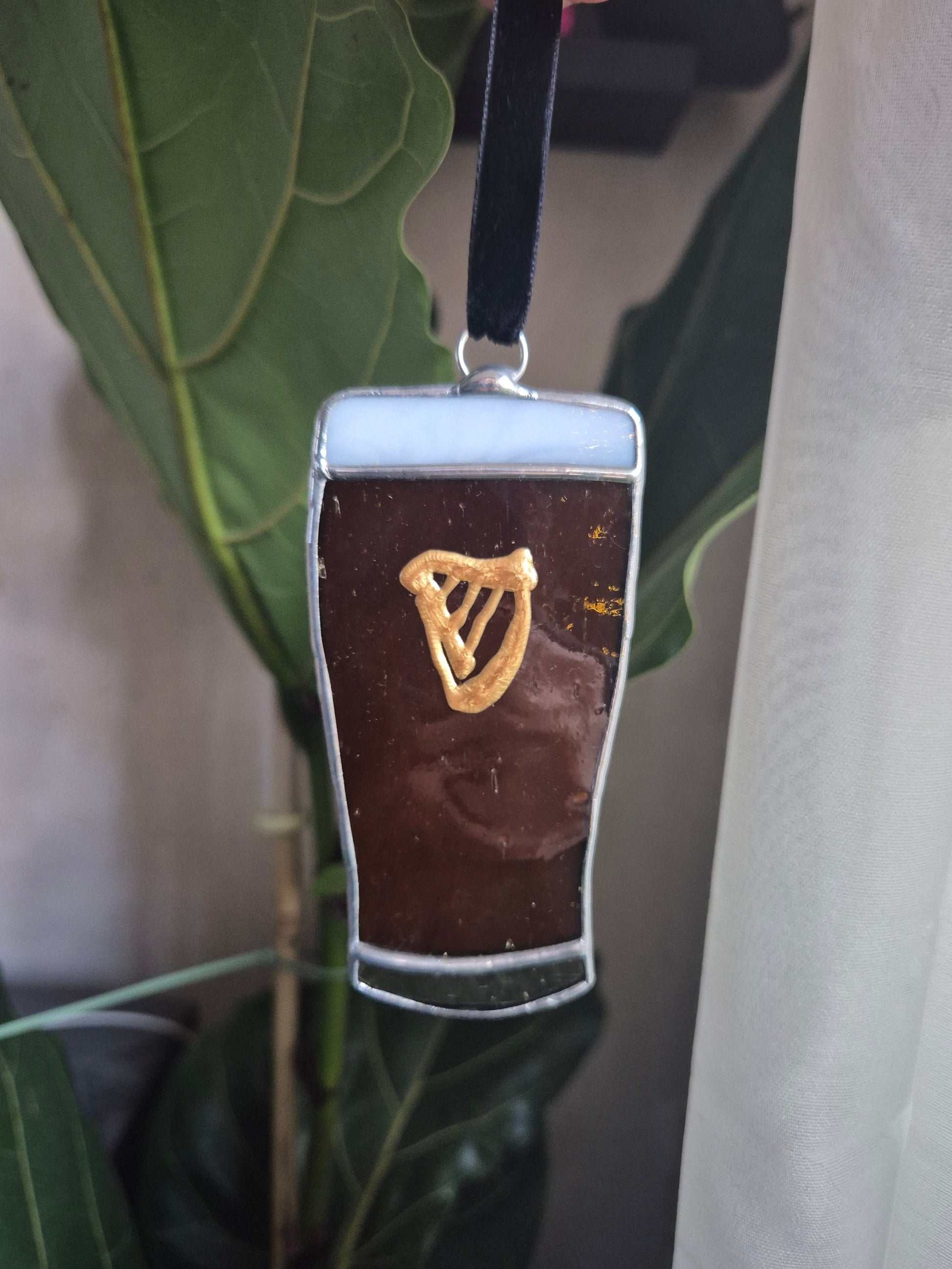 Handmade stained glass small hanging pint in dark brown, white and clear glass.