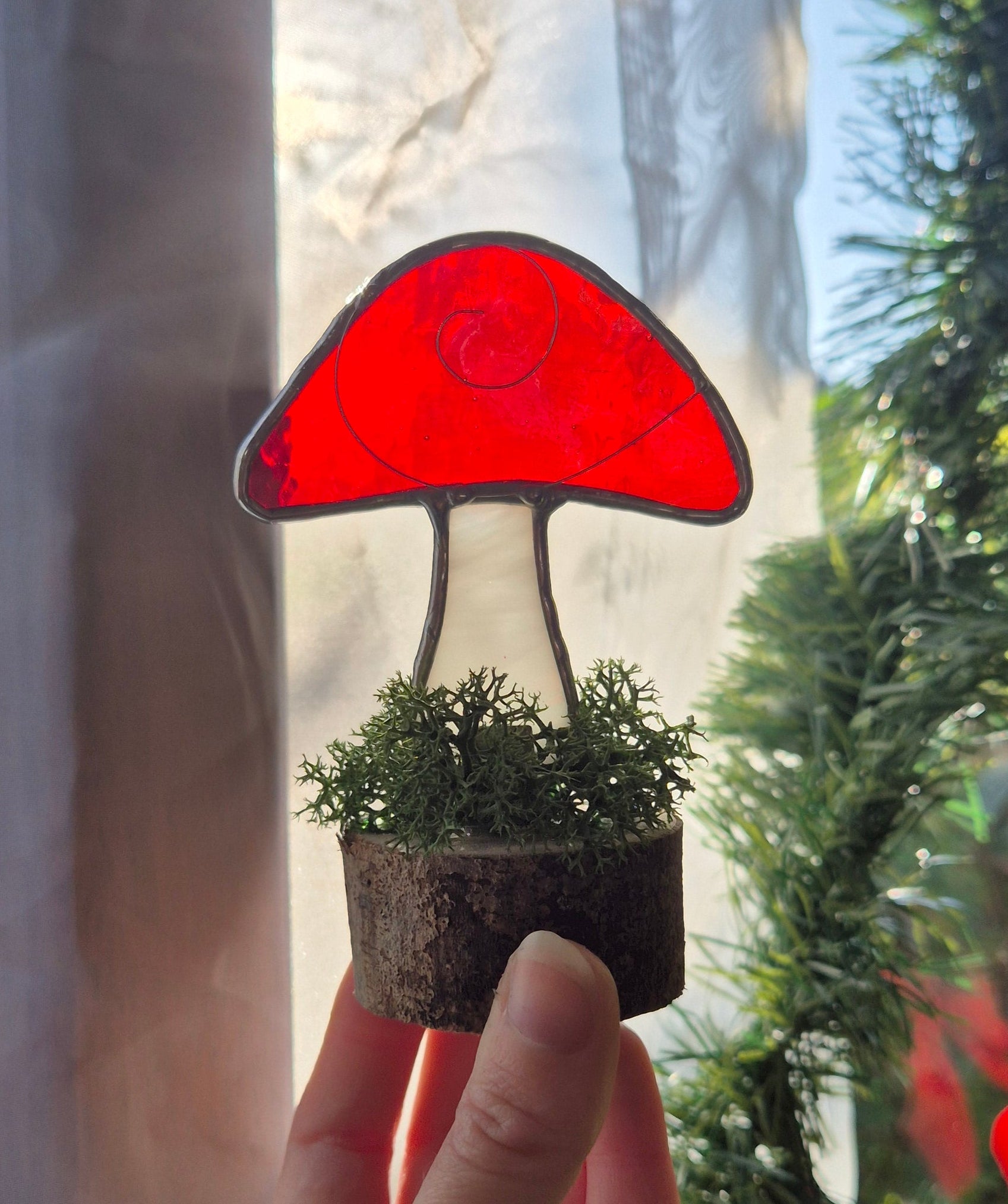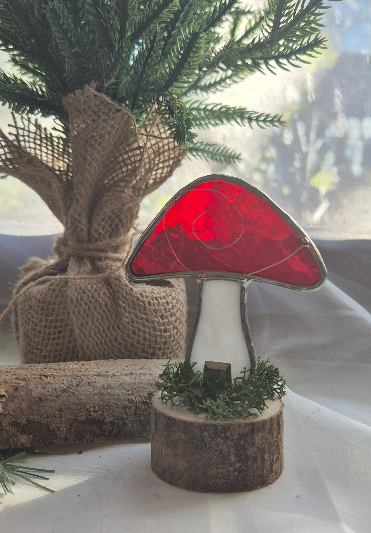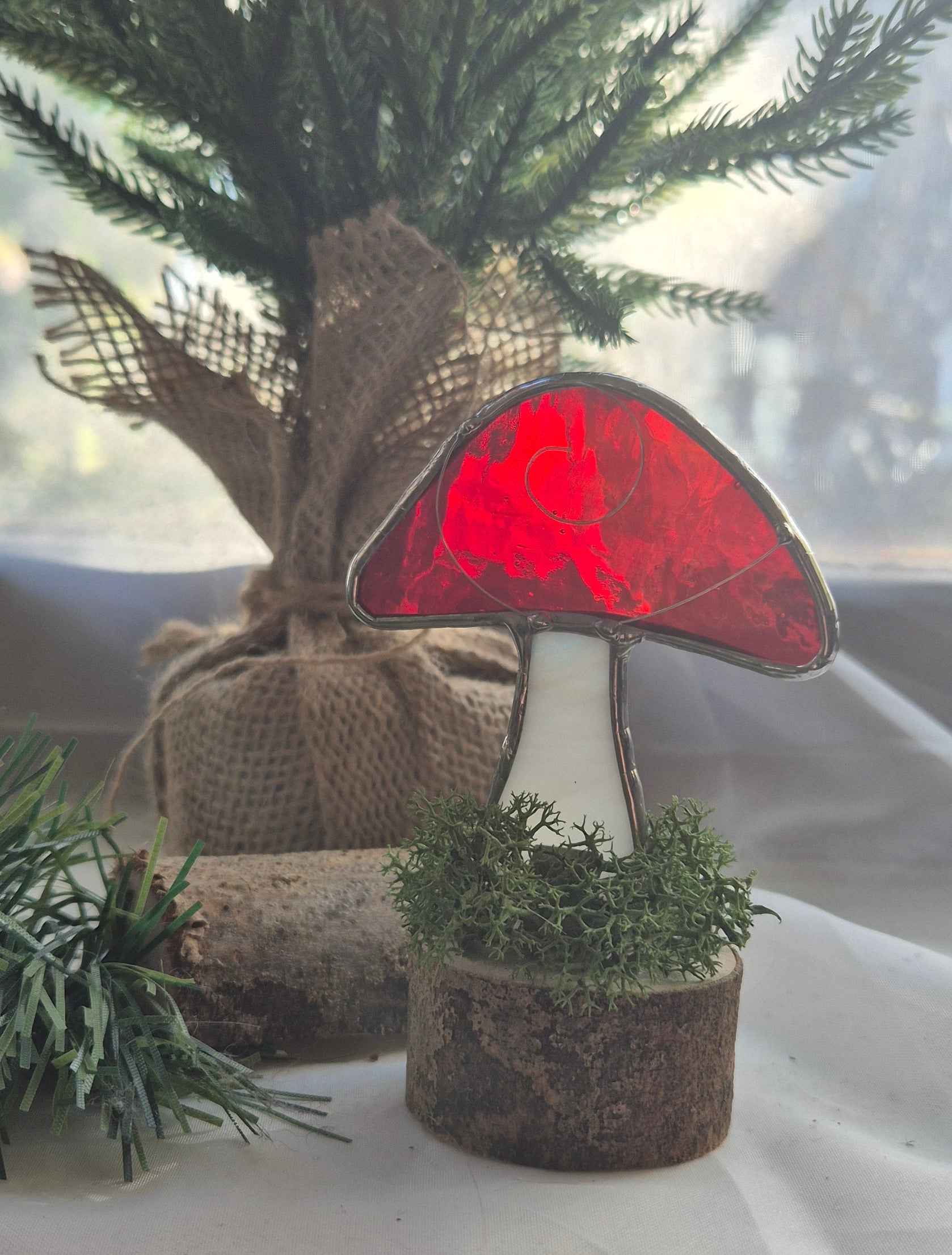 Handmade stained glass red and white standing mushroom suncatcher with a wooden branch base stand.