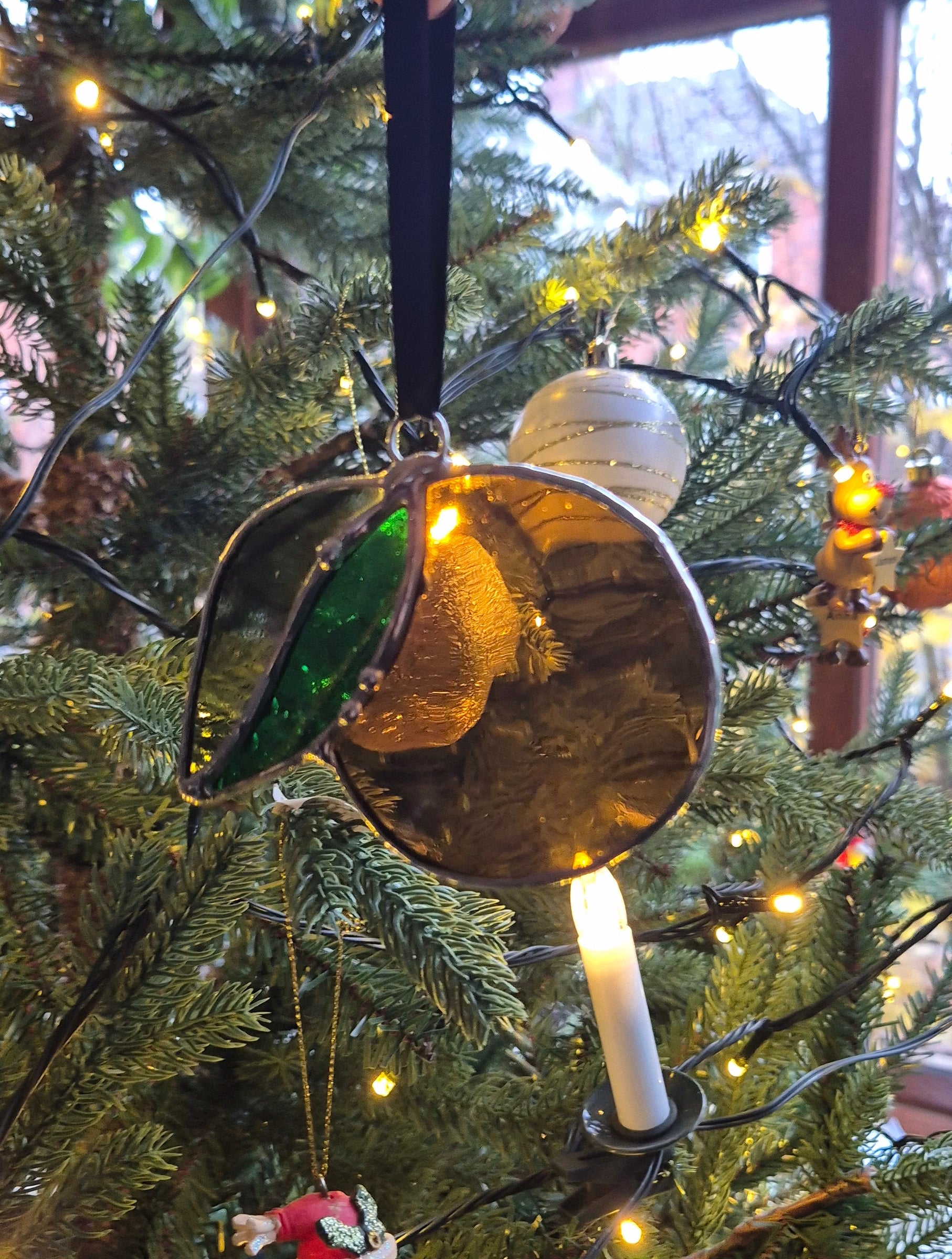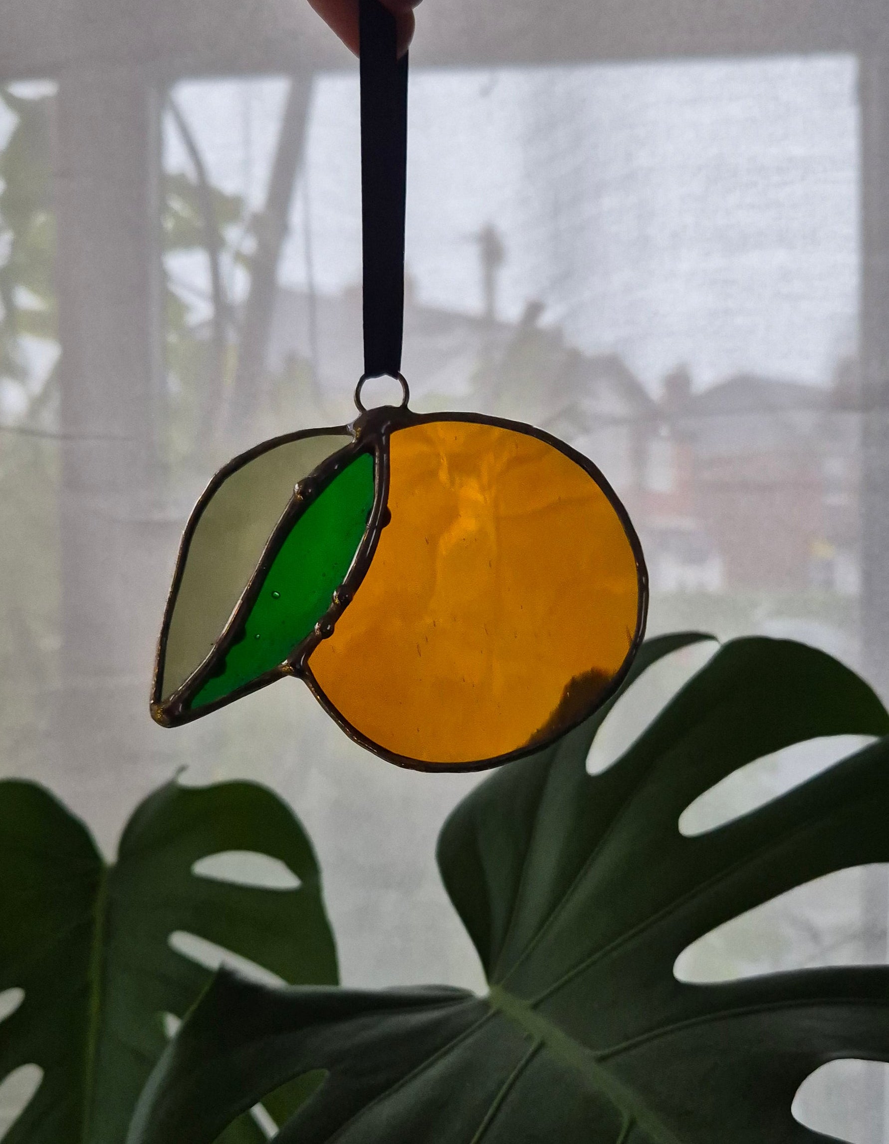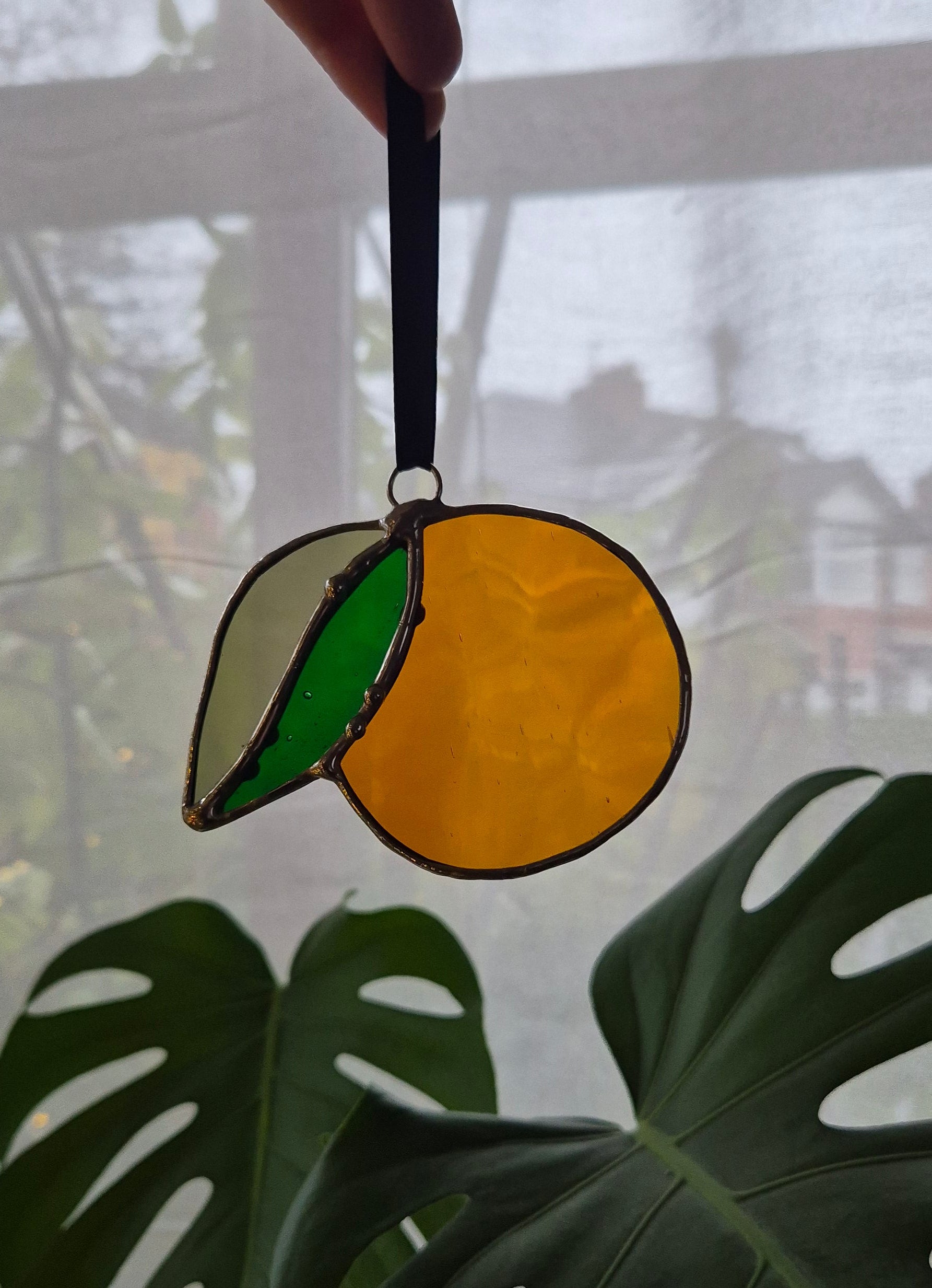Handmade small stained glass hanging lemon in a transparent orange and green glass.